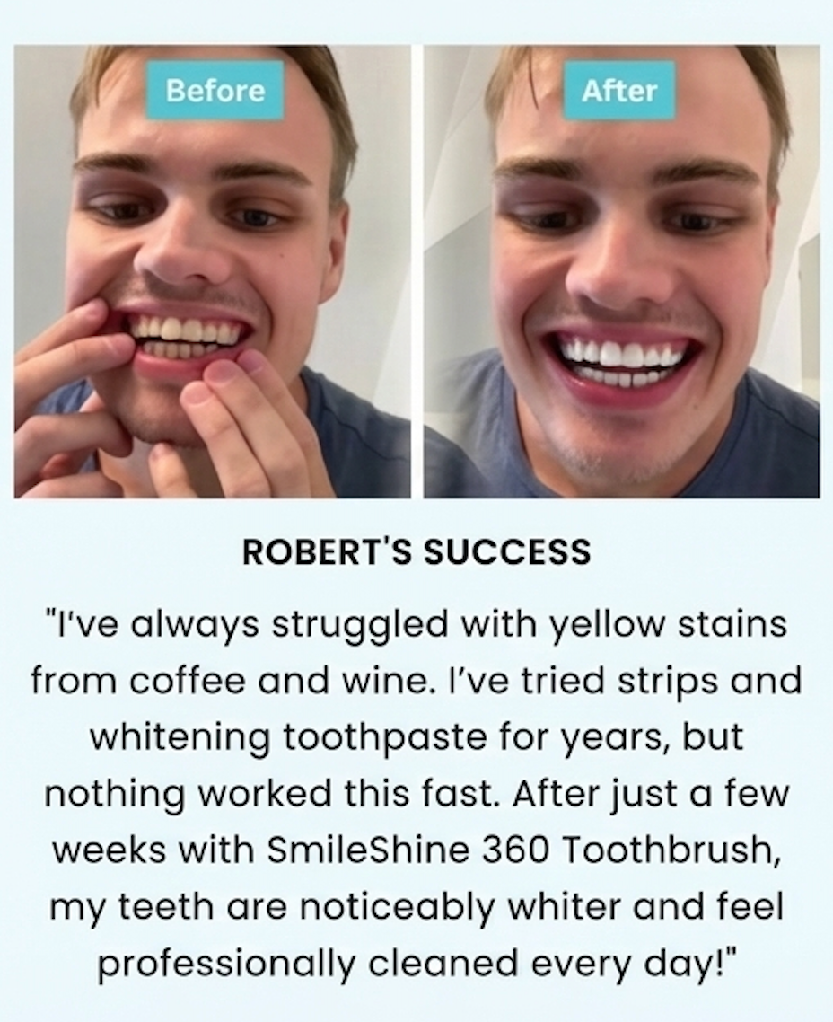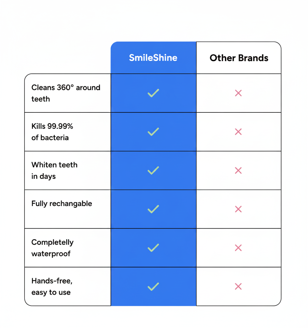 SmileShine uses a soft 360° mouthpiece design that brushes all sides of your teeth at once. Simply apply toothpaste, place it in your mouth, and move it gently from side to side for a few seconds — it cleans your whole mouth faster and more effectively than a regular brush.